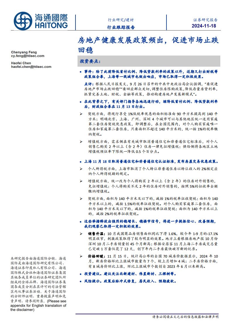 本报告深入分析了近期中国房地产市场出台的一系列健康发展政策及其初步成效。通过降低首付比例、贷款利率以及实施财税组合拳,政府旨在稳定市场预期并提振信心。数据显示,10月全国商品房销售面积同比降幅显著收窄至1.6%,远低于前三季度的-17.1%,且深圳、上海等一线城市二手房交易量创下新高。同时,10月全国70城新房和二手房价格环比上涨城市数量均有所增加,显示市场已出现止跌回暖的积极迹象。尽管政策效果显著,但仍需关注政策后可能出现的脉冲式修复以及居民收入和预期疲软的风险。建议投资者关注受益于市场复苏的建材行业龙头企业。