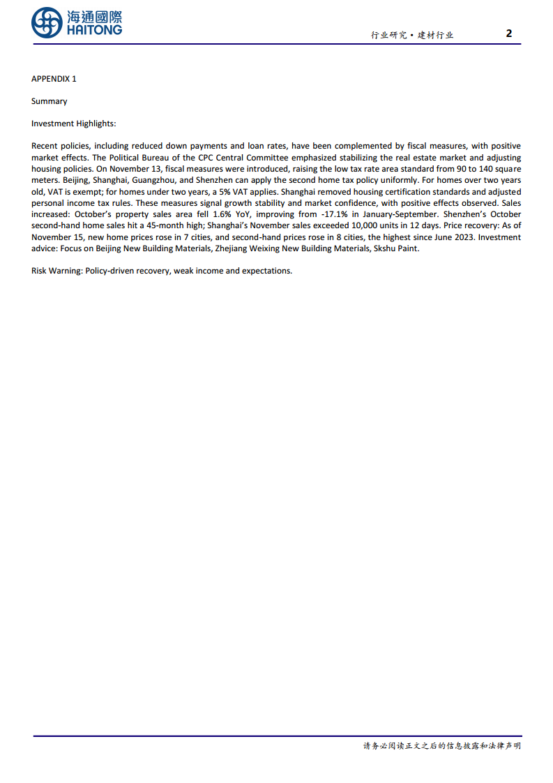 报告建议关注北新建材、伟星新材、三棵树等建材行业相关企业,这些企业有望受益于房地产市场的逐步回暖。同时,报告也提示了风险,包括政策后可能出现的脉冲式修复,以及居民收入和预期可能持续疲软的潜在影响。