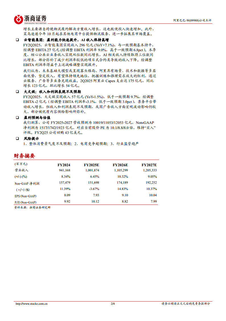 公司通过优化淘天集团的用户体验、强化国际商业的跨境电商引擎(速卖通Choice)、提升本地生活业务的规模与效率、以及推动云智能集团的盈利能力和AI收入高增长,持续巩固市场地位。尽管菜鸟和大文娱业务表现略低于预期,但整体战略方向清晰,旨在通过可控投入守住并夺回市场份额。分析师维持“买入”评级,并预测FY2025-2027营收和Non-GAAP净利润将持续增长,对应当前股价的PE倍数具有吸引力。