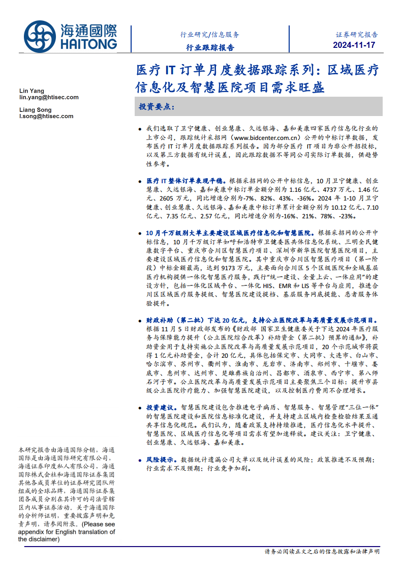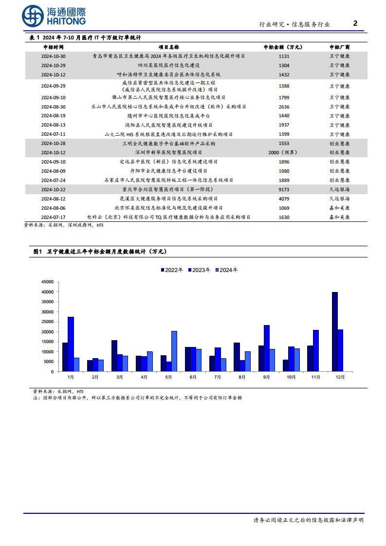 根据采招网公开中标数据,2024年10月,卫宁健康、创业慧康、久远银海、嘉和美康的中标订单金额分别为1.16亿元、4737万元、1.46亿元和2605万元,同比增速分别为-7%、82%、43%和-36%。从2024年1-10月的累计数据来看,四家公司中标订单累计金额分别为10.12亿元、7.10亿元、7.35亿元和2.57亿元,同比增速分别为-16%、21%、78%和-23%。整体而言,医疗IT市场订单表现保持平稳,部分企业如创业慧康和久远银海展现出较强的增长势头。