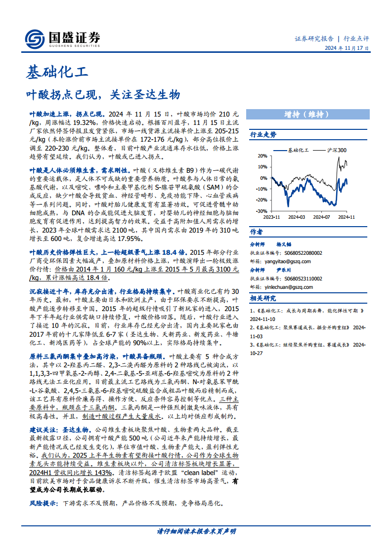 基础化工:叶酸拐点已现,关注圣达生物