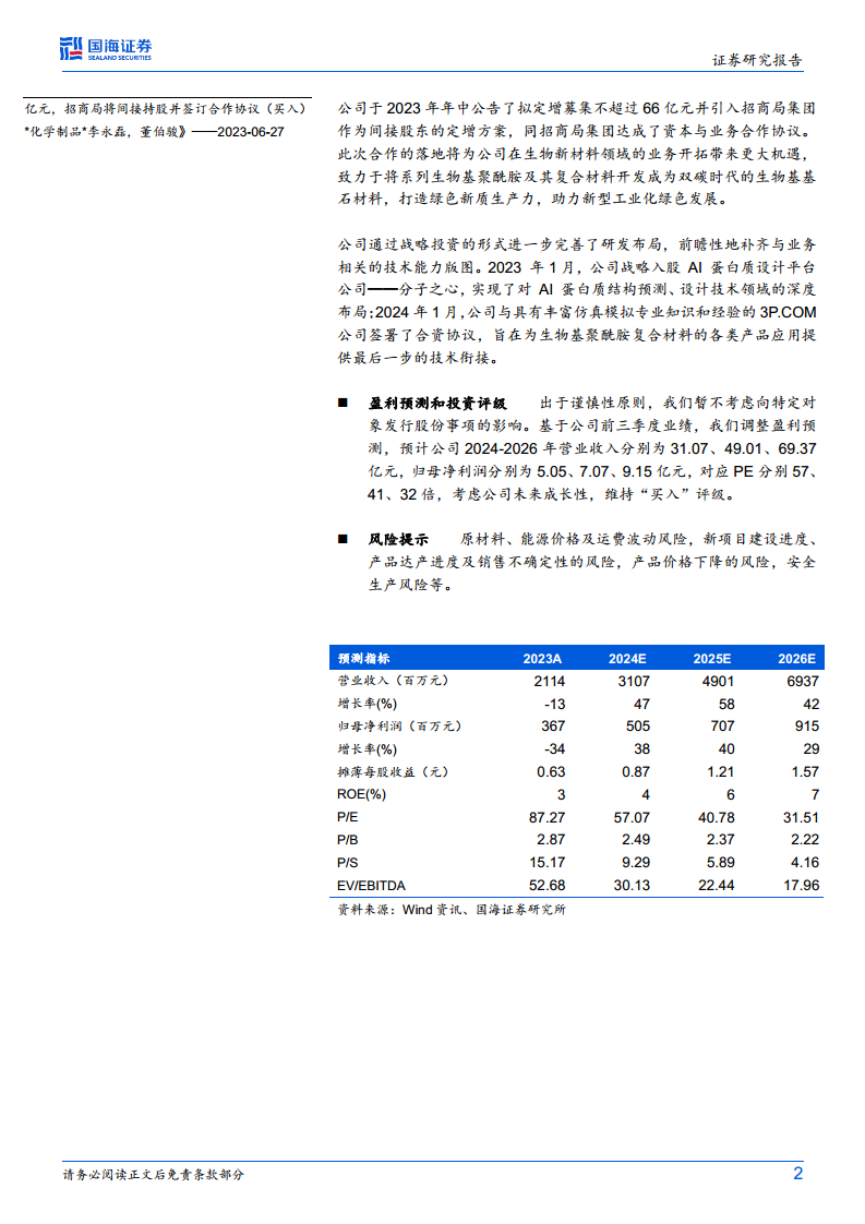 凯赛生物于2023年年中公告了拟定增募集不超过66亿元并引入招商局集团作为间接股东的方案,并与招商局集团达成了资本与业务合作协议。此次合作预计将为公司在生物新材料领域的业务拓展带来更大机遇,共同致力于将系列生物基聚酰胺及其复合材料开发成为“双碳”时代的生物基基石材料,助力绿色新质生产力发展。