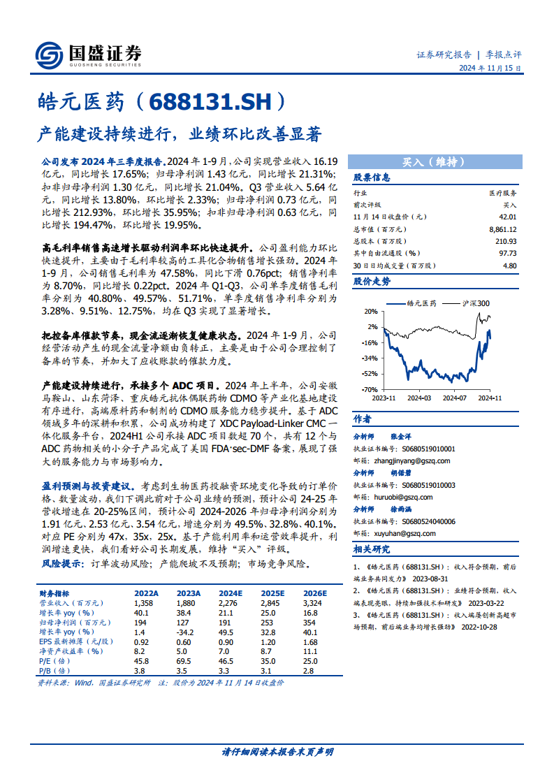 皓元医药在2024年第三季度展现出强劲的业绩增长和盈利能力改善,这主要得益于高毛利率产品的销售贡献以及有效的现金流管理。公司持续推进产能建设,特别是在ADC领域取得了显著进展,通过一体化服务平台承接了大量项目并获得FDA备案,进一步巩固了其市场地位。尽管分析师下调了短期业绩预测,但基于产能利用率和运营效率的提升,以及未来利润的快速增长潜力,公司长期发展前景依然被看好,维持“买入”评级。投资者需关注订单波动、产能爬坡及市场竞争等潜在风险。