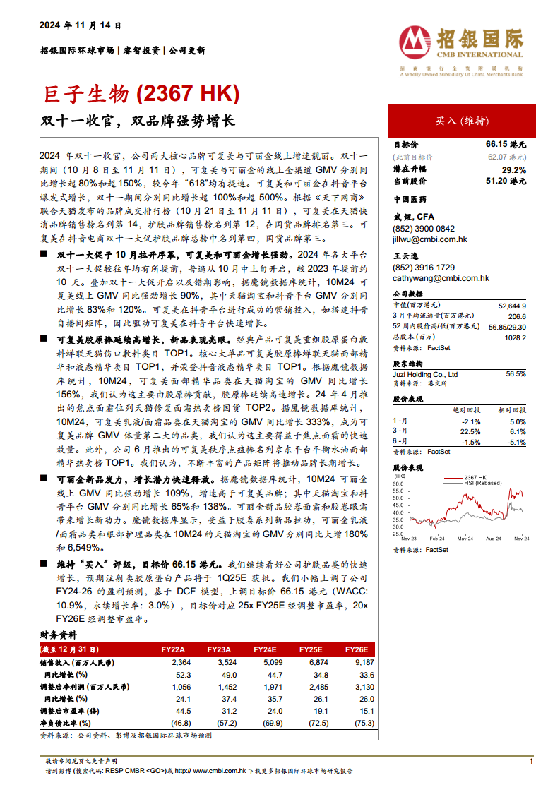 巨子生物在2024年双十一大促中展现出强劲的线上销售增长势头,两大核心品牌可复美和可丽金的GMV均实现高速增长,尤其在抖音等新兴电商平台表现突出。公司通过经典产品的持续热销和多款新品的成功推出,有效巩固了市场地位并拓展了增长空间。鉴于其卓越的市场表现和未来的增长潜力,招银国际环球市场维持“买入”评级,并上调目标价至66.15港元,反映了市场对其护肤品类增长和新产品线前景的积极预期。