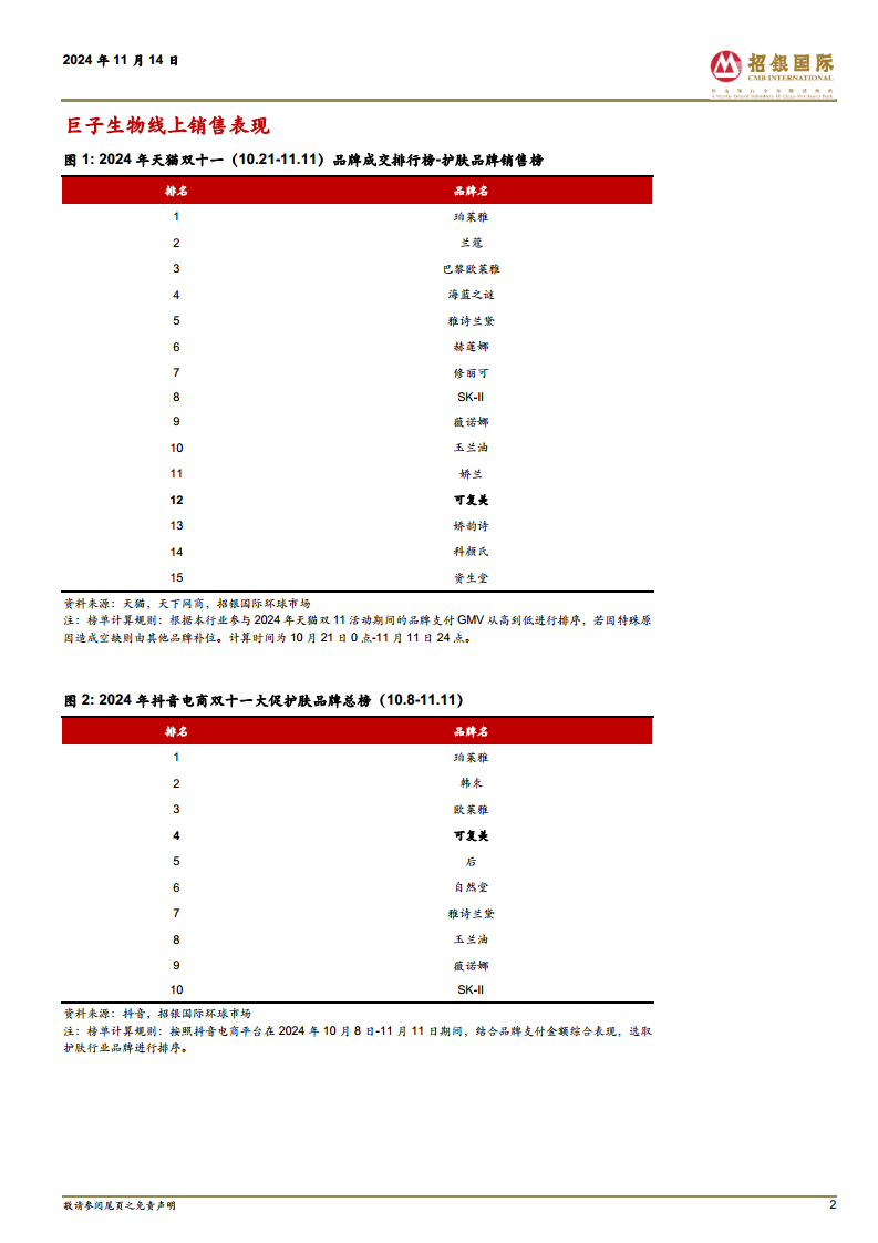 2024年双十一大促提前启动,巨子生物旗下可复美和可丽金两大核心品牌线上增速靓丽。双十一期间(10月8日至11月11日),可复美和可丽金的线上全渠道GMV分别同比增长超80%和超150%,均较今年“618”有所提速。特别是在抖音平台,可复美和可丽金分别实现了超100%和超500%的爆发式增长。根据《天下网商》联合天猫发布的品牌成交排行榜,可复美在天猫快消品牌销售榜名列第14,护肤品牌销售榜名列第12,国货品牌排名第三。在抖音电商双十一大促护肤品牌总榜中,可复美名列第四,国货品牌第三。