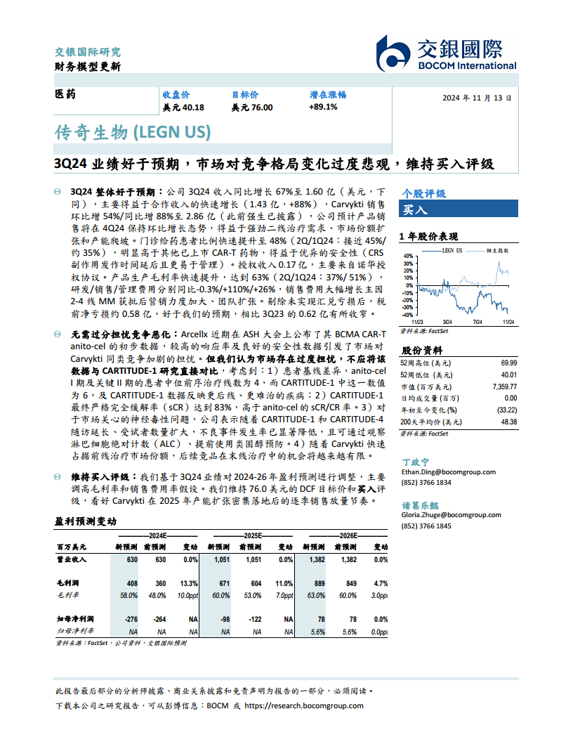 传奇生物(LEGN):3Q24业绩好于预期,市场对竞争格局变化过度悲观,维持买入评级