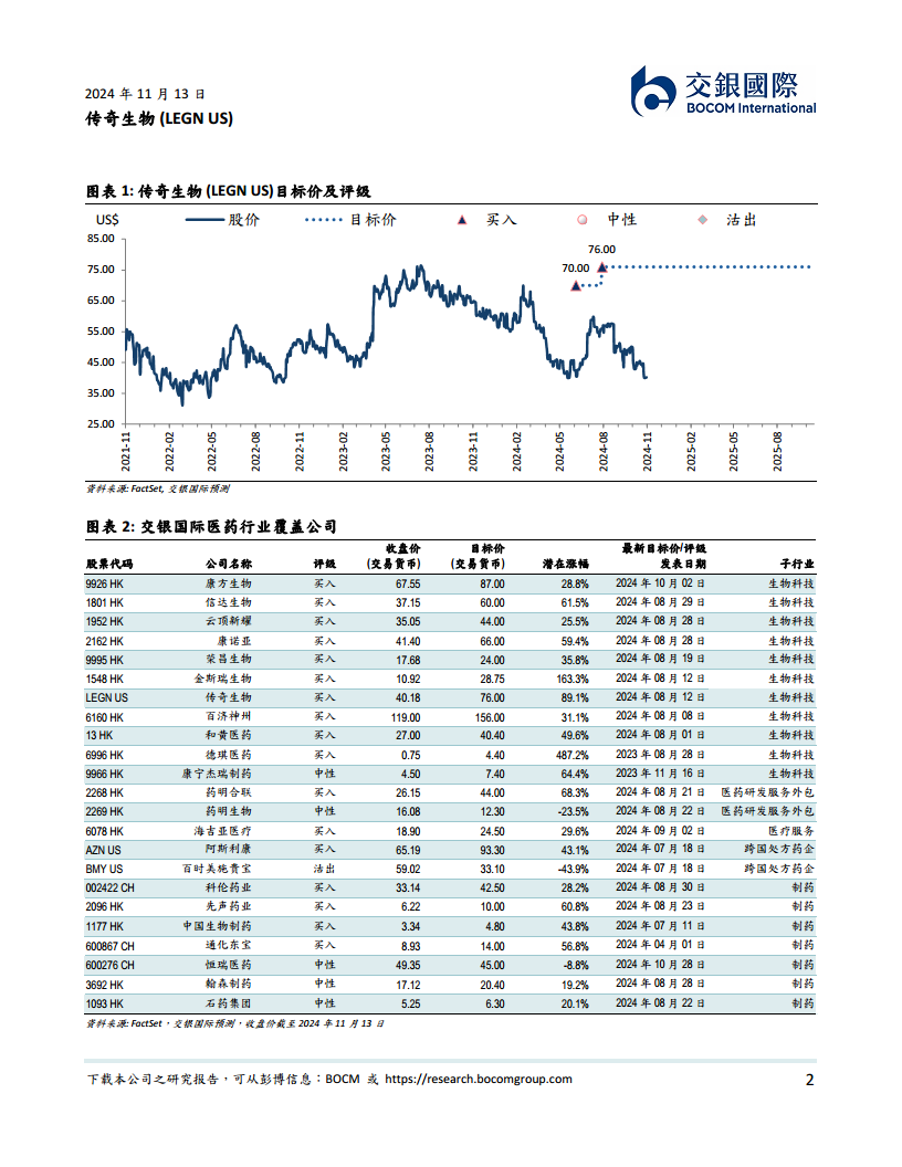 本报告对传奇生物(LEGN US)2024年第三季度的业绩进行了全面分析,指出公司表现超出预期,核心产品Carvykti销售强劲增长,运营效率显著提升,毛利率大幅改善,且亏损收窄。报告深入剖析了市场对竞争格局的担忧,并通过详细数据和分析驳斥了过度悲观的观点,强调Carvykti在患者基线、疗效和安全性管理方面的优势,以及其在前线治疗市场中建立的强大壁垒。基于对公司基本面的积极评估和对未来增长潜力的信心,交银国际维持了传奇生物的“买入”评级和76.0美元的目标价,并对其在产能扩张后的销售放量前景持乐观态度。