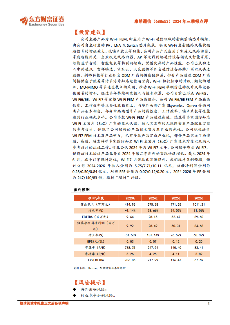 康希通信在2024年第三季度表现出强劲的增长势头,其收入加速增长主要得益于在Wi-Fi7技术协议产品上的成功布局和市场渗透。尽管为保持技术领先地位而加大了研发投入,导致短期内归母净利润承压,但公司在国产化替代方面取得了显著进展,市场份额不断提升。面对Wi-Fi7标准的全球普及和设备市场的爆发式增长,康希通信凭借其完整的产品线、与国际主流SoC厂商的深度合作以及Wi-Fi7产品更高的平均销售价格,占据了有利的市场地位。此外,公司通过设立产业基金积极拓展相关芯片领域,进一步巩固了其在通信芯片行业的战略布局。尽管面临海外竞争和行业竞争加剧的风险,但公司在技术创新、市场拓展和产业投资方面的努力,预示着其未来持续增长的潜力。