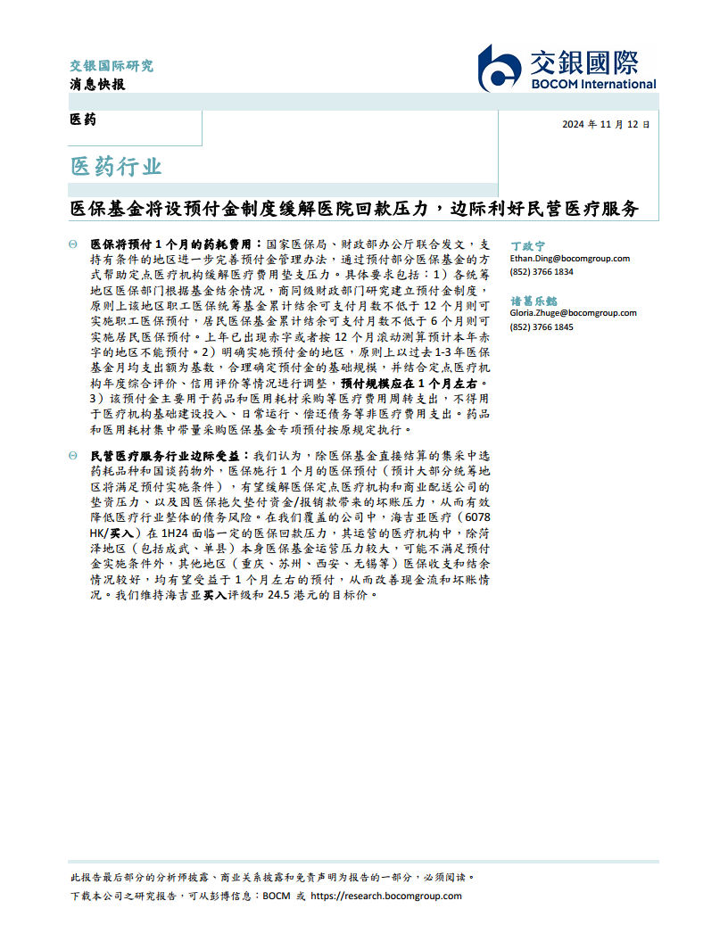 医保基金将设预付金制度缓解医院回款压力,边际利好民营医疗服务