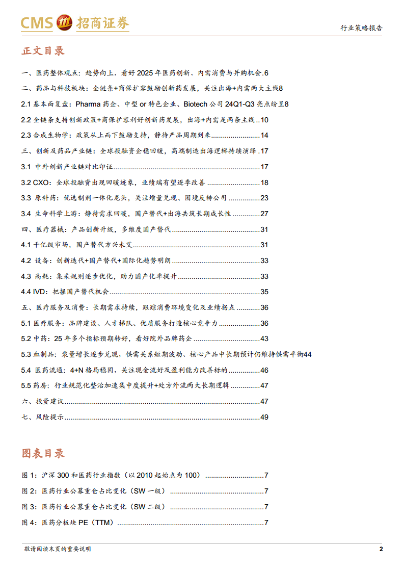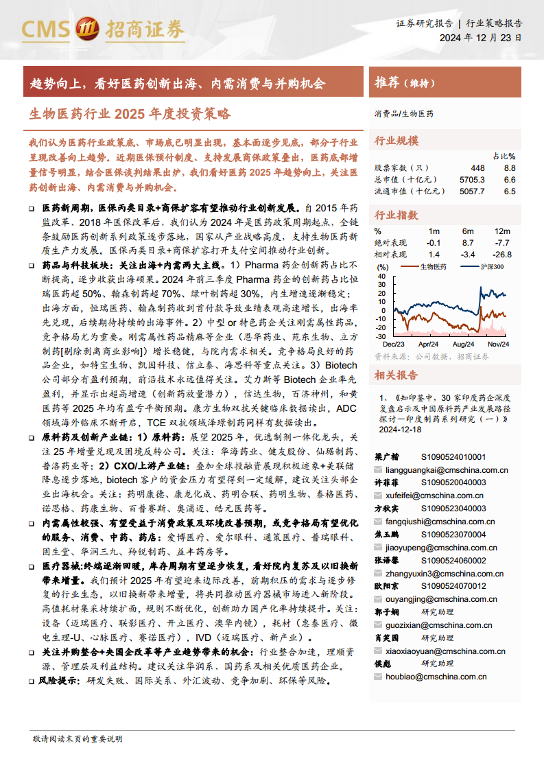 本报告核心观点认为,中国生物医药行业已明显触及政策底和市场底,基本面正逐步改善,部分子行业呈现积极向上的趋势。随着近期医保预付制度、支持发展商业医疗保险政策的密集出台,以及医保谈判结果的落地,医药行业底部增量信号显著。报告对2025年医药行业整体趋势持乐观态度,预计将迎来向上发展。