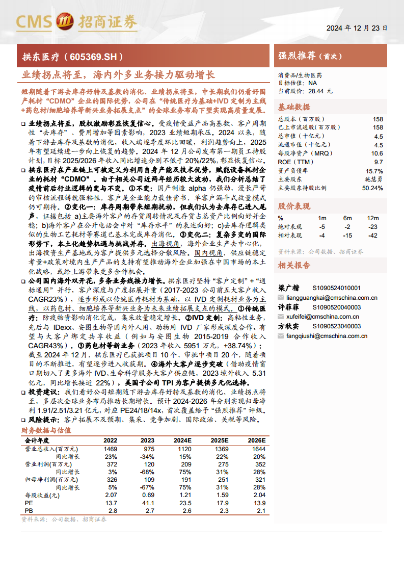 招商证券看好拱东医疗短期内随下游去库存好转及基数消化带来的业绩拐点,以及多层次全球业务布局推动的长期增长。