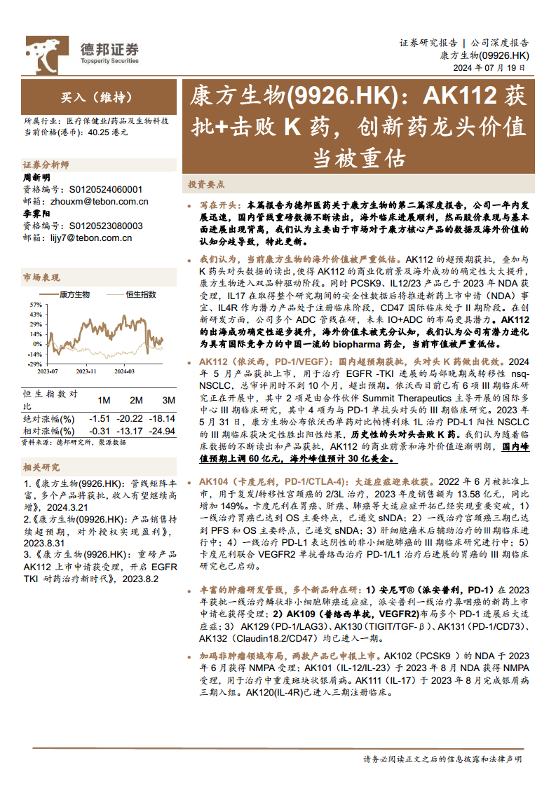 康方生物(09926):AK112获批+击败K药,创新药龙头价值当被重估
