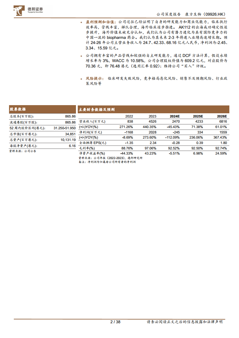 康方生物不仅在肿瘤领域拥有AK112和AK104两大重磅产品,其非肿瘤管线(如PCSK9、IL12/23、IL17、IL4R)也已有多款产品进入后期临床或申报上市阶段,展现出均衡且多元化的产品布局。此外,公司在ADC等前沿技术领域的布局也预示着未来的增长潜力。AK112与Summit Therapeutics的海外合作进一步强化了其全球化商业布局,预计现有适应症的海外销售峰值将超过30亿美元,为公司带来显著的国际市场收入。基于DCF估值模型,报告维持“买入”评级,目标价为76.48港元,认为公司未来2-3年将进入业绩高速增长期。