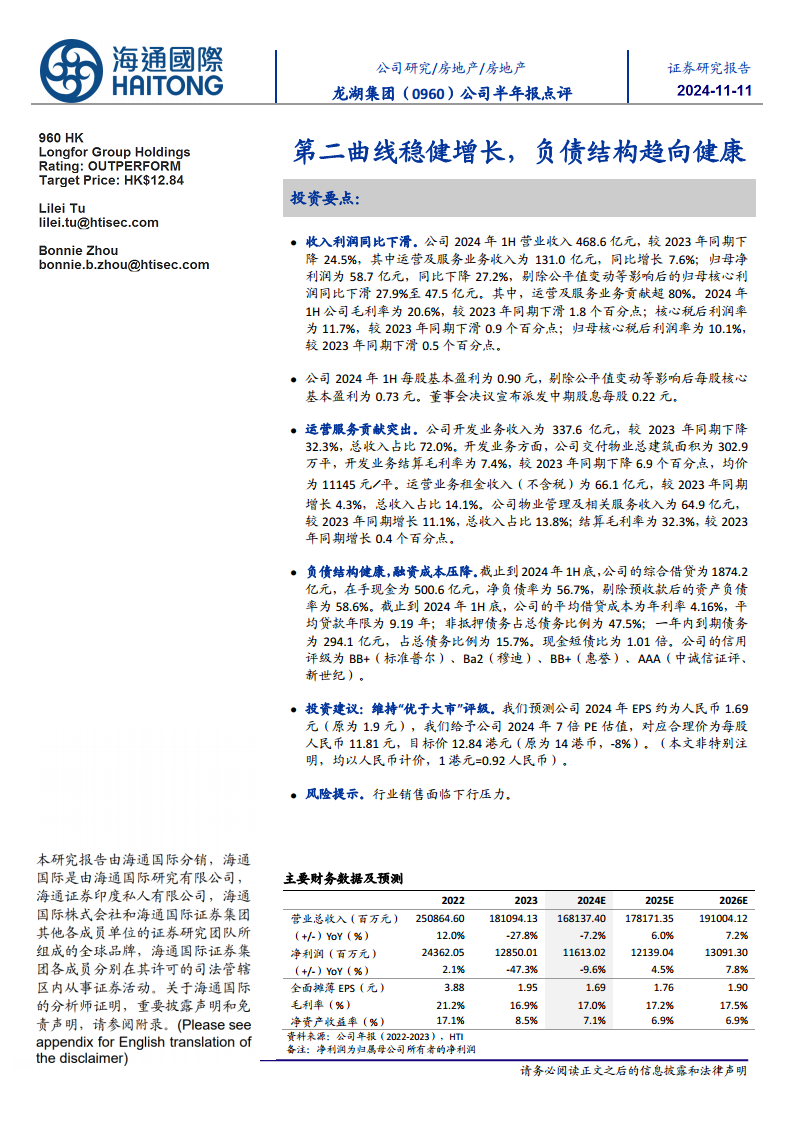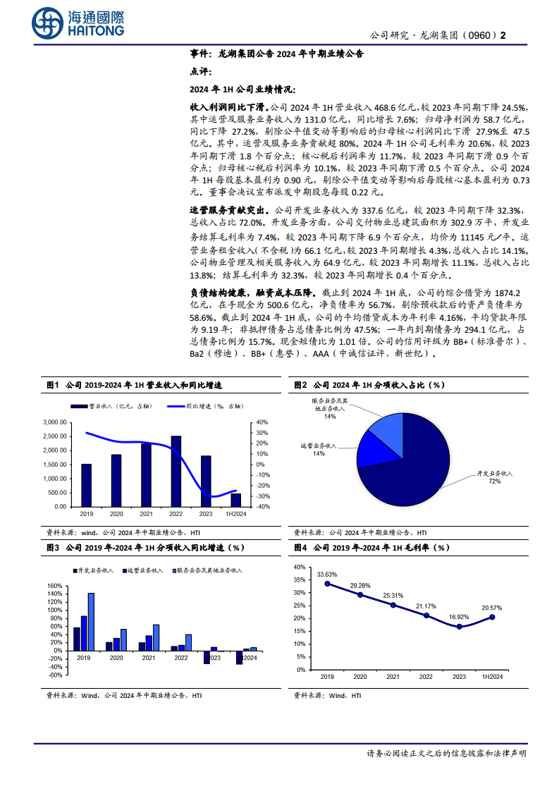 - 龙湖集团2024年上半年业绩显示,在房地产开发业务面临下行压力的背景下,公司整体收入和归母净利润同比下滑。