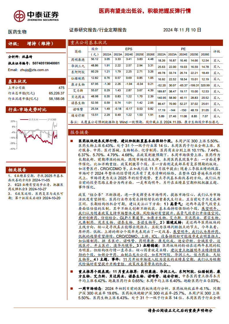 2024年11月,医药生物板块在政策利好和市场整体回暖的背景下,展现出强劲的复苏态势,有望逐步走出长期低谷。尽管年初至今表现滞后,但当前估值已低于历史平均水平,且多项政策持续推进,为行业提供了明确的结构性投资机会。投资者应积极把握这一反弹行情,重点关注创新药、仿创结合、GLP-1等高景气赛道,以及原料药、CRO/CDMO、ICL等困境反转领域。同时,业绩稳健的中药和血制品龙头,以及由并购重组、政策改善等主题事件驱动的个股也值得关注。然而,仍需警惕政策扰动、药品质量问题以及研究报告信息滞后或更新不及时的风险。