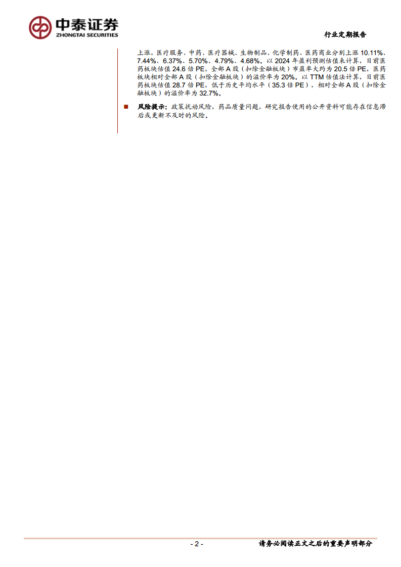 从估值角度看,基于2024年盈利预测,医药板块的市盈率(PE)为24.6倍,相较于全部A股(扣除金融板块)的20.5倍PE,溢价率为20%。若采用TTM估值法,医药板块当前估值为28.7倍PE,低于其历史平均水平35.3倍PE,相对全部A股(扣除金融板块)的溢价率为32.7%。尽管2024年初至今医药板块收益率为-6.1%,跑输沪深300指数(19.6%)达25.7%,但当前估值低于历史平均,显示出潜在的投资价值。