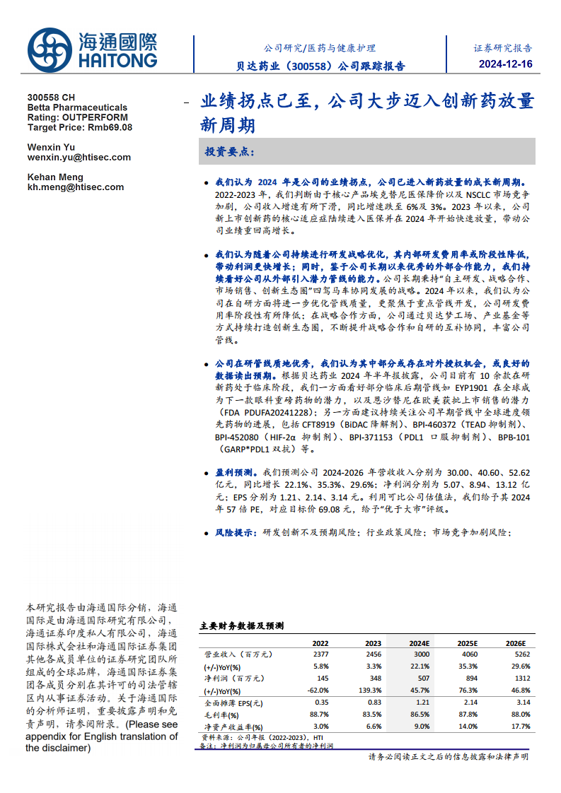- 估值与评级: 基于可比公司估值法,报告给予贝达药业2024年57倍的市盈率(PE),对应目标价69.08元,并维持“优于大市”的投资评级,体现了对公司未来增长潜力的认可。
