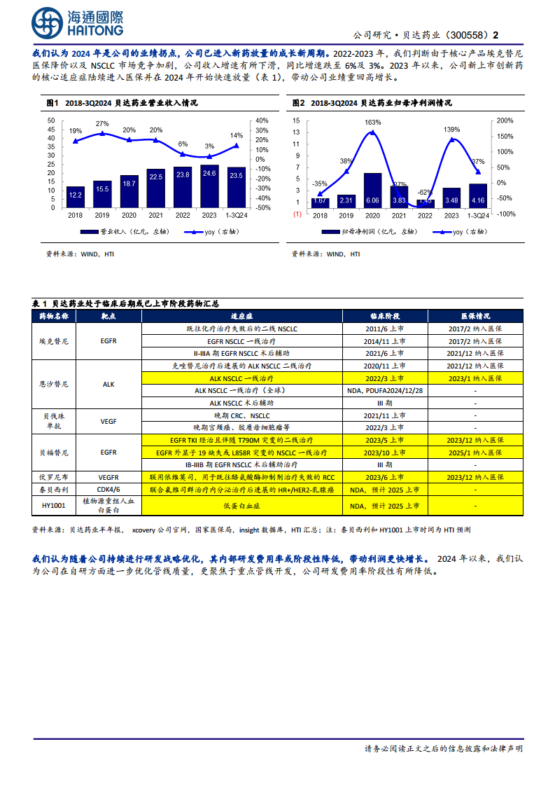 - 新药放量与业绩反转: 自2023年以来,公司新上市的创新药,如恩沙替尼(ALK NSCLC一线治疗)、贝福替尼(EGFR TKI经治且伴随T790M突变的二线治疗及EGFR外显子19缺失或L858R突变的NSCLC一线治疗)等,其核心适应症陆续成功进入国家医保目录。这一关键进展使得这些新药在2024年开始实现快速放量,预计将带动公司业绩重回高增长轨道。