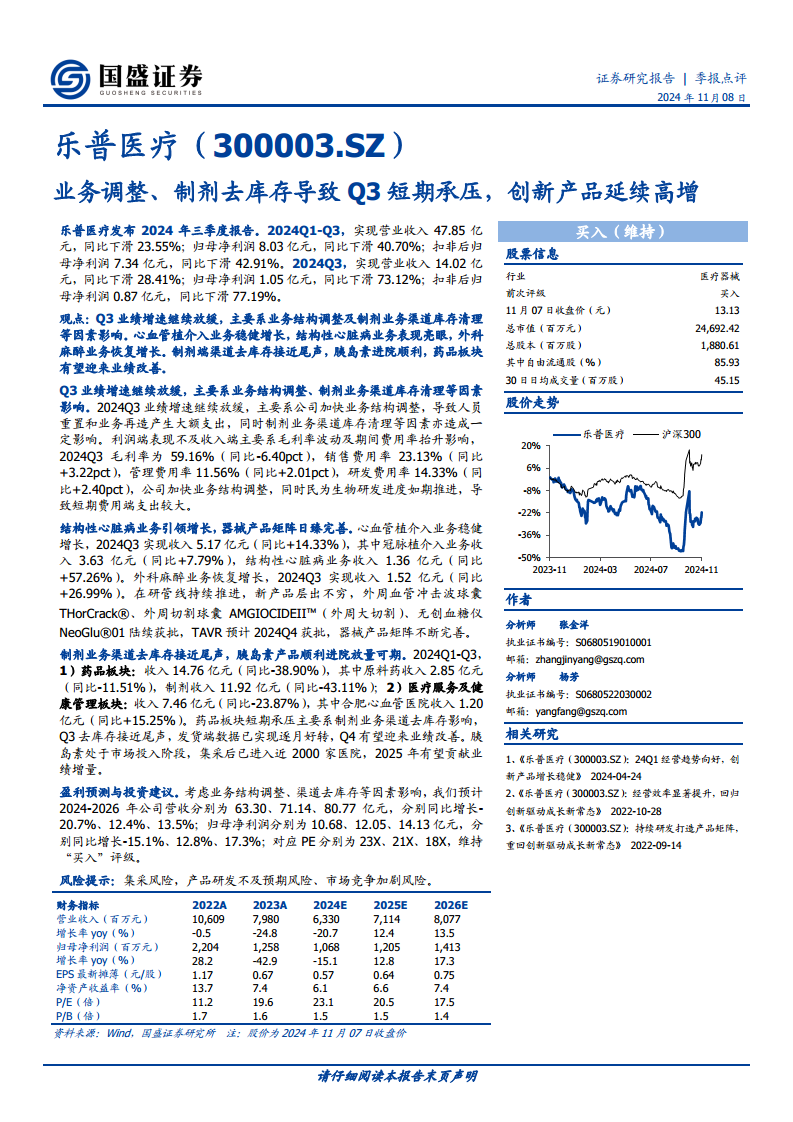 乐普医疗在2024年第三季度因业务结构调整和制剂渠道去库存而面临短期业绩压力,导致营收和利润出现显著下滑。然而,公司在器械业务领域,特别是结构性心脏病业务,展现出强劲的增长势头和持续完善的创新产品布局。制剂业务的渠道去库存已接近尾声,胰岛素等新产品有望在未来贡献业绩增量。分析师预计,随着短期不利因素的逐步消除,乐普医疗的业绩有望在2025年恢复增长,并维持“买入”评级,但投资者需警惕集采、研发和市场竞争等潜在风险。