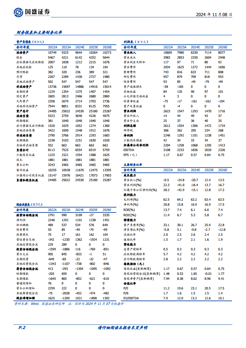 利润端表现不及收入端,主要受到毛利率波动及期间费用率抬升的影响。2024年第三季度毛利率为59.16%,同比下降6.40个百分点。同期,销售费用率、管理费用率和研发费用率均有所上升,分别达到23.13%(同比+3.22pct)、11.56%(同比+2.01pct)和14.33%(同比+2.40pct)。这表明公司在业务结构调整和民为生物研发进度推进过程中,短期内费用支出较大,影响了盈利能力。