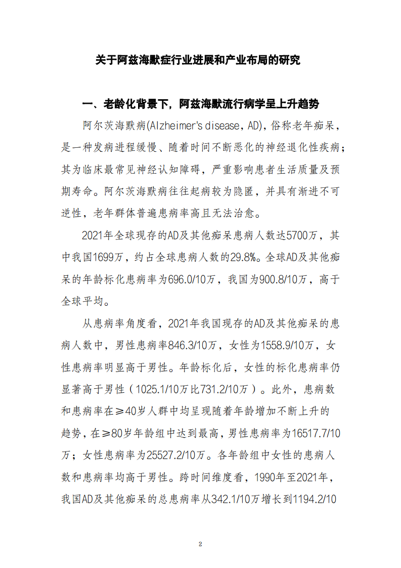 阿尔茨海默病行业研究:老龄化趋势下的流行病学特征与产业布局分析