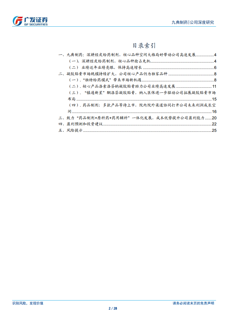 九典制药凭借其在经皮给药制剂领域的深厚积累和技术优势,以独家医保剂型洛索洛芬钠凝胶贴膏为核心驱动力,实现了显著的业绩增长。公司通过院内集采和院外线上线下渠道的协同发力,持续扩大市场份额。新产品酮洛芬凝胶贴膏的获批及纳入医保,进一步巩固了公司在消炎镇痛市场的地位。同时,公司坚持“药品制剂+原料药+药用辅料”一体化发展战略,构建了成本优势和多元化产品管线,多款高端经皮给药制剂有望陆续上市,为未来业绩增长提供强劲动力。尽管面临技术创新、新产品研发不确定性及环保风险,但公司凭借其核心竞争力、市场布局和丰富的产品储备,预计未来盈利能力将持续提升。基于此,报告给予九典制药“买入”评级,目标价26.53元/股。