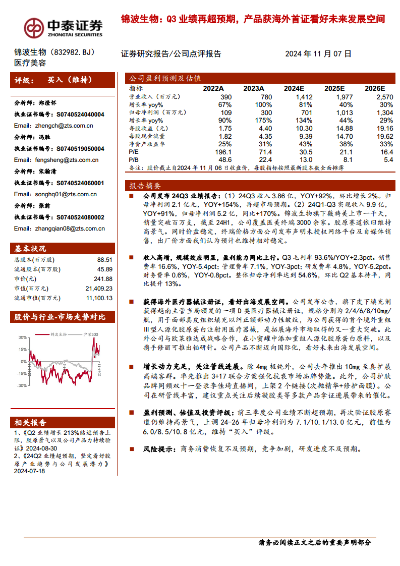 锦波生物:Q3业绩再超预期,产品获海外首证看好未来发展空间