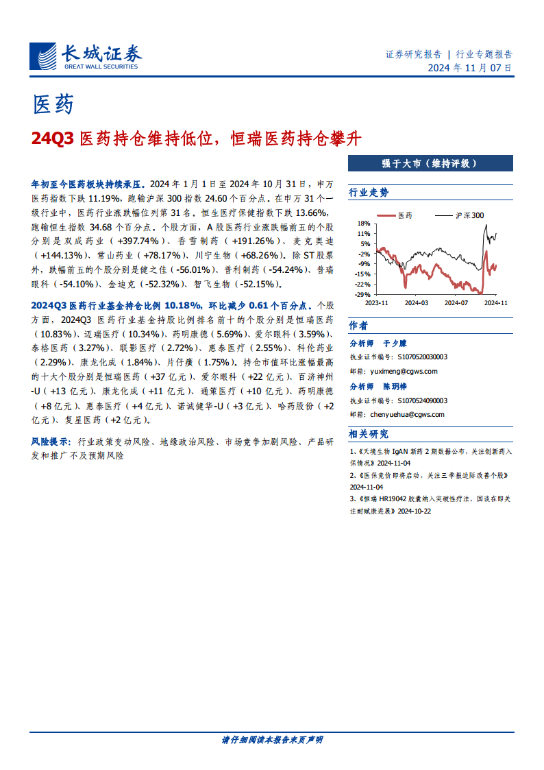 24Q3医药持仓维持低位,恒瑞医药持仓攀升
