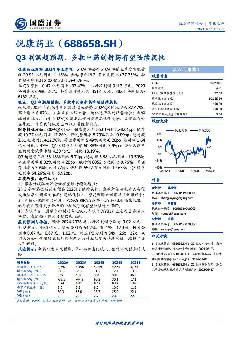悦康药业(688658):Q3利润超预期,多款中药创新药有望陆续获批