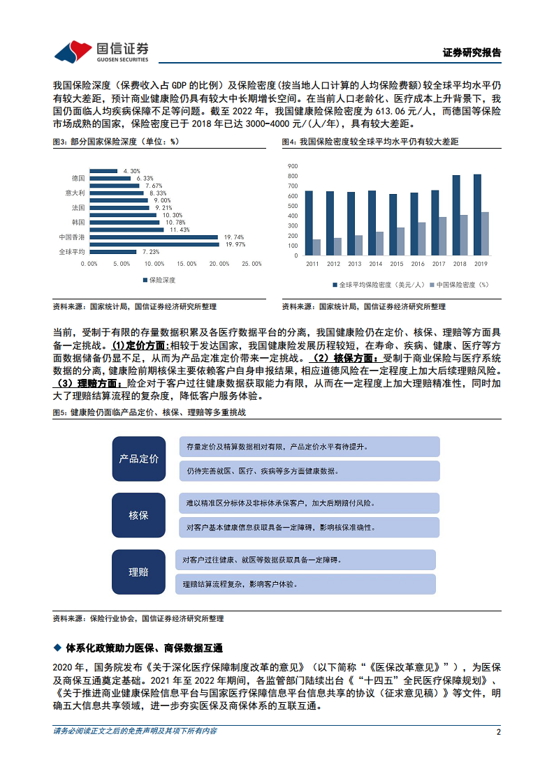 当前,我国健康险在定价、核保、理赔等核心业务环节面临挑战。在定价方面,由于发展历程较短,我国在寿命、疾病、健康、医疗等方面的基础数据储备不足,难以实现产品的精准定价。在核保方面,商业保险与医疗系统数据分离,主要依赖客户自身申报,增加了道德风险和后续理赔风险。在理赔方面,险企获取客户过往健康数据能力有限,影响了理赔的精准性和时效性,同时也增加了理赔结算流程的复杂度,降低了客户服务体验。