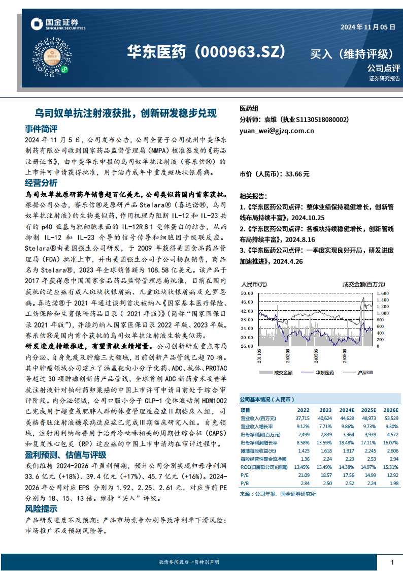 华东医药乌司奴单抗生物类似药赛乐信®的获批上市,是公司在自身免疫疾病领域的重要里程碑,使其成为国内首家拥有该产品的企业。鉴于原研药在全球的巨大销售额和中国庞大的银屑病患者群体,赛乐信®具备显著的市场潜力,有望成为公司新的业绩增长点。公司在内分泌、自身免疫和肿瘤领域的丰富研发管线,以及其在自身免疫领域积累的商业化优势,将共同驱动公司未来业绩的持续增长。然而,产品研发、市场竞争和推广效果等风险因素仍需关注。