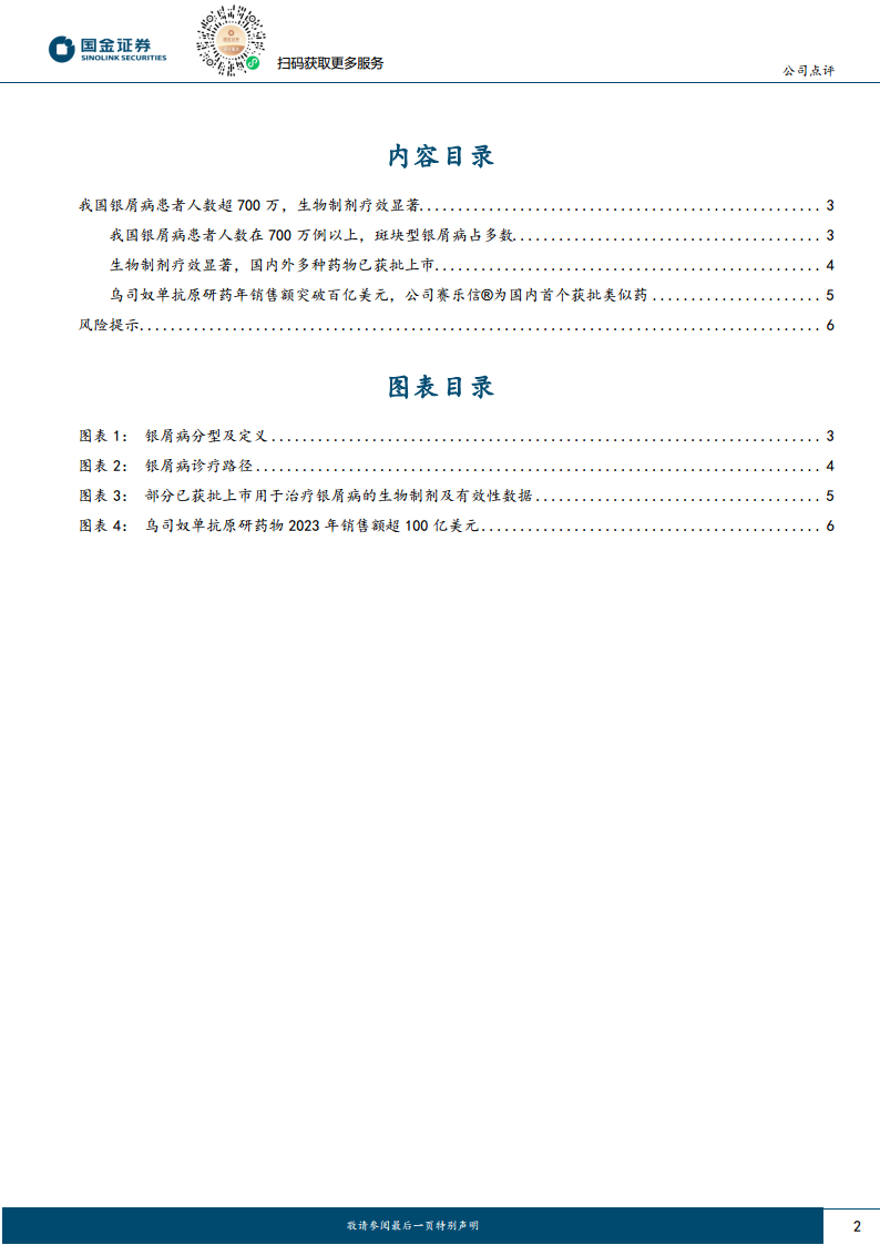 据估算,我国银屑病患者人数超过700万例,且患病率呈逐渐上升趋势。其中,斑块状银屑病约占所有病例的80%~90%。银屑病是一种免疫介导的慢性疾病,常合并心血管疾病(10.2%)、代谢性疾病、心理疾病(焦虑30.2%,抑郁21.7%)等多种共病。根据《中国银屑病诊疗指南(2023版)》,早期启用生物制剂可带来显著的近期和远期疗效,并能改善炎症性共病症状,降低停药后复发风险,实现“疾病修饰”。国内外已有多类生物制剂获批用于银屑病治疗,包括TNF-α抑制剂、IL-12/23抑制剂、IL-23抑制剂、IL-17A抑制剂等。