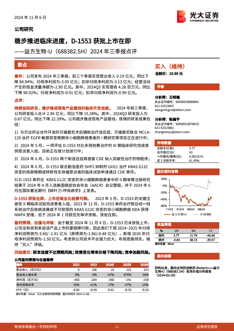 本报告对益方生物-U(688382.SH)2024年三季报进行分析,核心观点在于公司持续的研发投入和关键产品D-1553的临床进展,尤其是在D-1553即将获批上市的背景下,其未来商业化前景值得期待。尽管公司当前面临营收大幅下滑和持续亏损的财务压力,但分析师维持“买入”评级,主要基于其强大的技术平台潜力和领先的布局思路。