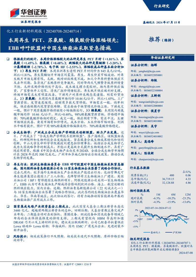 化工行业新材料周报(20240708-20240714):本周再生PET、苏氨酸、赖氨酸价格涨幅领先,EBB呼吁欧盟对中国生物柴油采取紧急措施