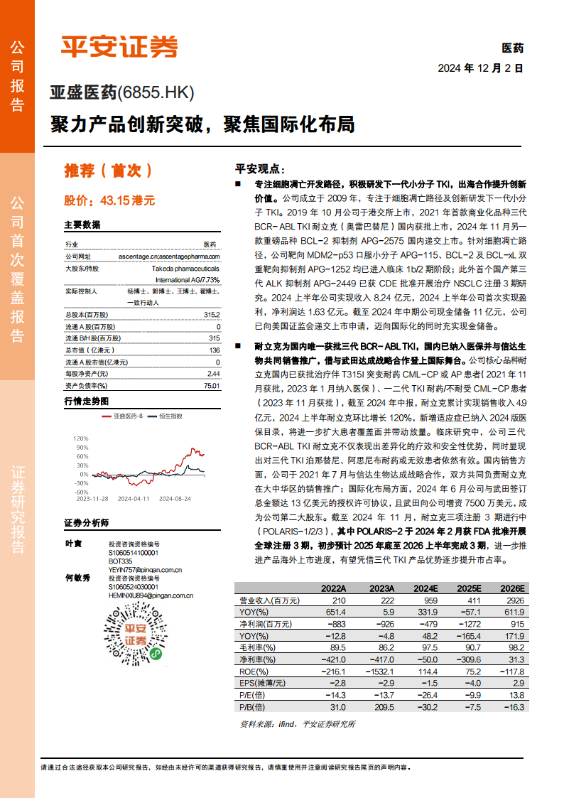 亚盛医药专注于细胞凋亡路径及下一代小分子酪氨酸激酶抑制剂(TKI)的创新研发,致力于解决未被满足的临床需求。公司通过自主研发和国际合作,积极推进核心产品的全球化布局,旨在提升创新价值并拓展市场份额。