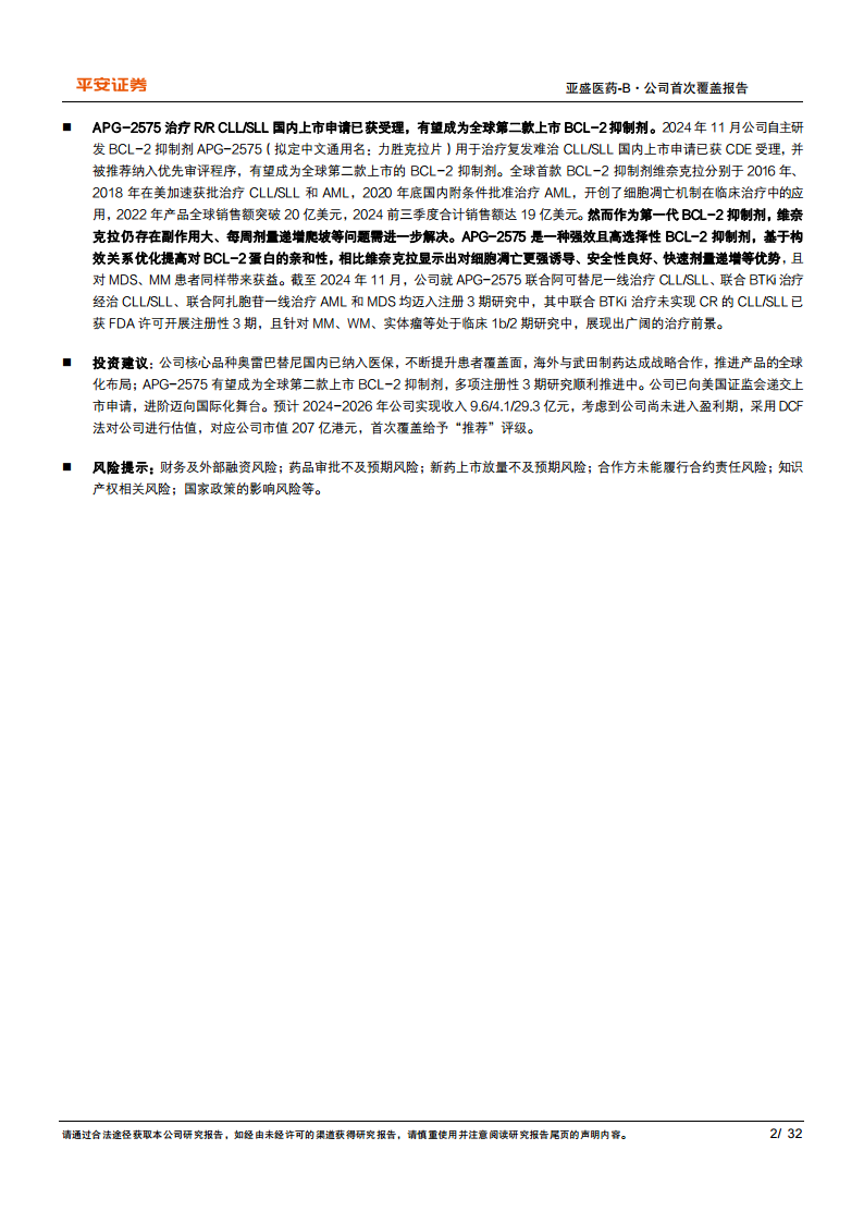 公司核心产品耐立克(奥雷巴替尼)作为国内唯一获批的第三代BCR-ABL TKI,已成功纳入医保并与信达生物合作推广,同时通过与武田制药的战略合作加速全球化进程。另一重磅产品APG-2575(BCL-2抑制剂)已在国内递交上市申请,有望成为全球第二款上市的BCL-2抑制剂,展现出巨大的市场潜力和差异化优势。