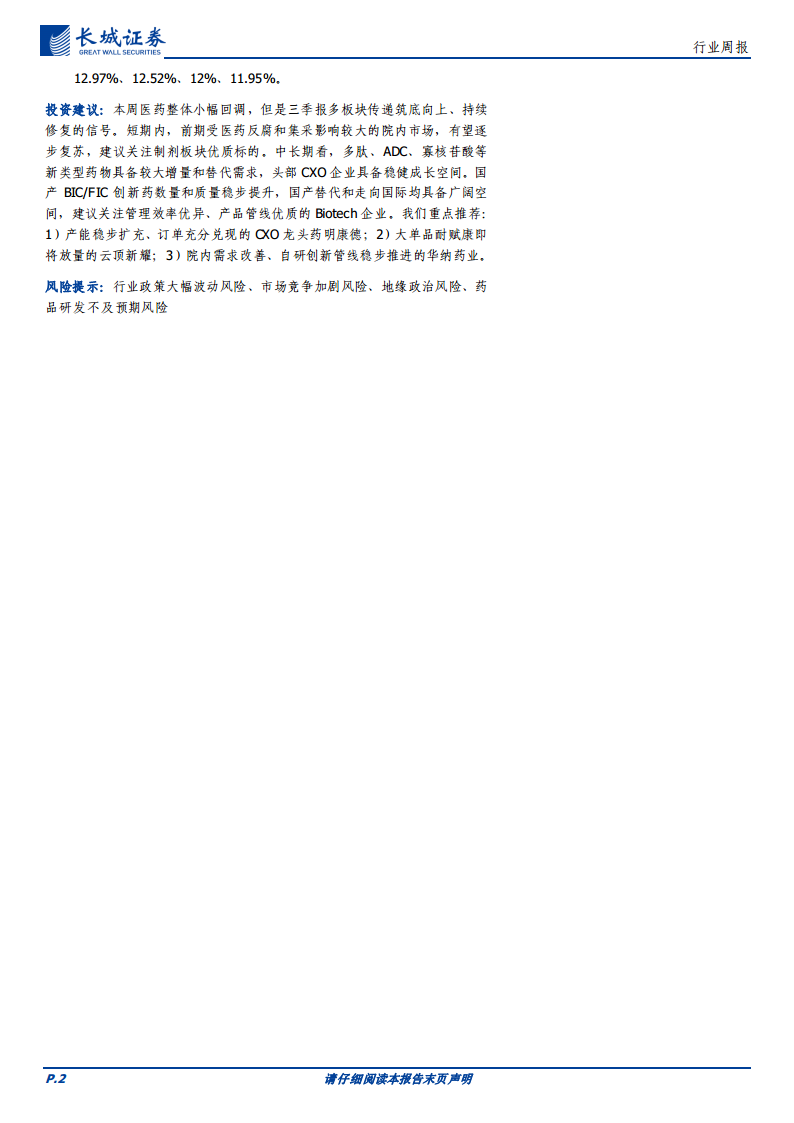 尽管短期市场波动,但报告强调医药行业长期发展仍由创新驱动。多肽、ADC、寡核苷酸等新型药物具备巨大的增量和替代需求,头部CXO企业展现出稳健的成长空间。国产BIC/FIC(Best-in-Class/First-in-Class)创新药的数量和质量稳步提升,国产替代和国际化进程均具备广阔前景,为具备优秀管理效率和优质产品管线的Biotech企业提供了重要的投资机遇。