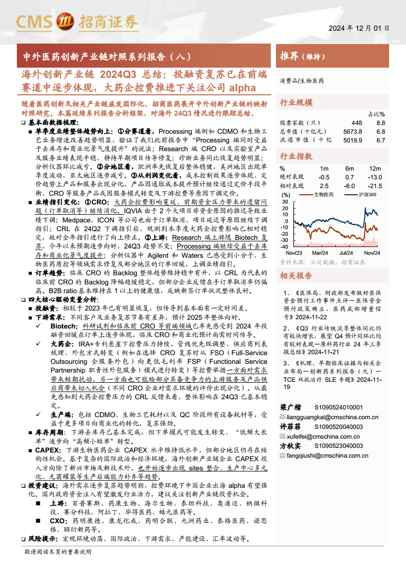 2024年第三季度,海外医药创新产业链展现出稳步回暖的积极信号,尤其体现在前端投融资的显著复苏。尽管大型药企的控费策略仍在持续,并对部分CRO服务定价和订单造成短期扰动,但其影响已趋于稳定,并为具备竞争力的供应商提供了结构性切入机会。下游去库存已基本完成,市场正适应“高频小短单”的新采购模式。资本支出方面,企业正通过站点整合、战略并购和在新兴市场及新技术领域的投入,进行结构性调整以增强核心能力。