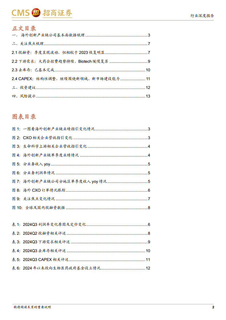 - 科研试剂和临床前CRO等前端领域已率先感受到2024年投融资回暖在订单上逐步体现。Charles River的DSA业务中小型Biotech收入环比Q2维稳,但同比表现出更积极的恢复信号。