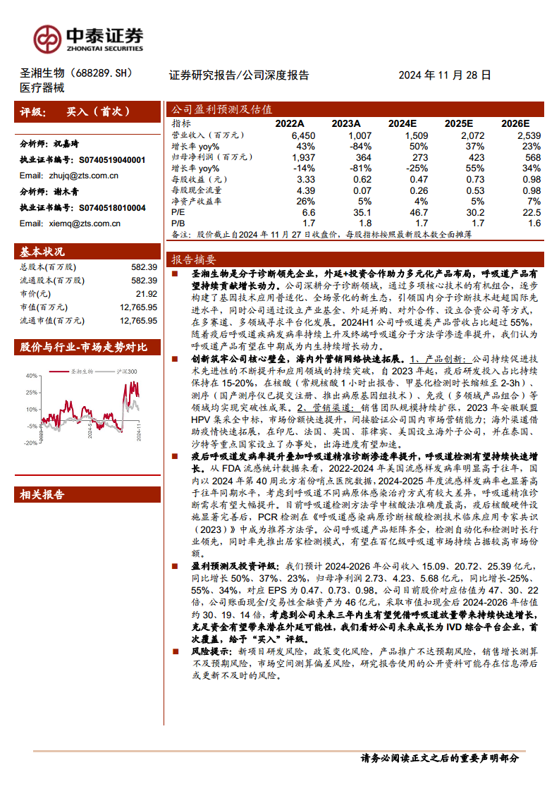 综合考虑公司未来三年有望凭借呼吸道业务放量带来持续快速增长,以及充足资金有望带来潜在外延可能性,我们看好公司未来成长为IVD综合平台企业。因此,我们首次覆盖圣湘生物,并给予“买入”评级。