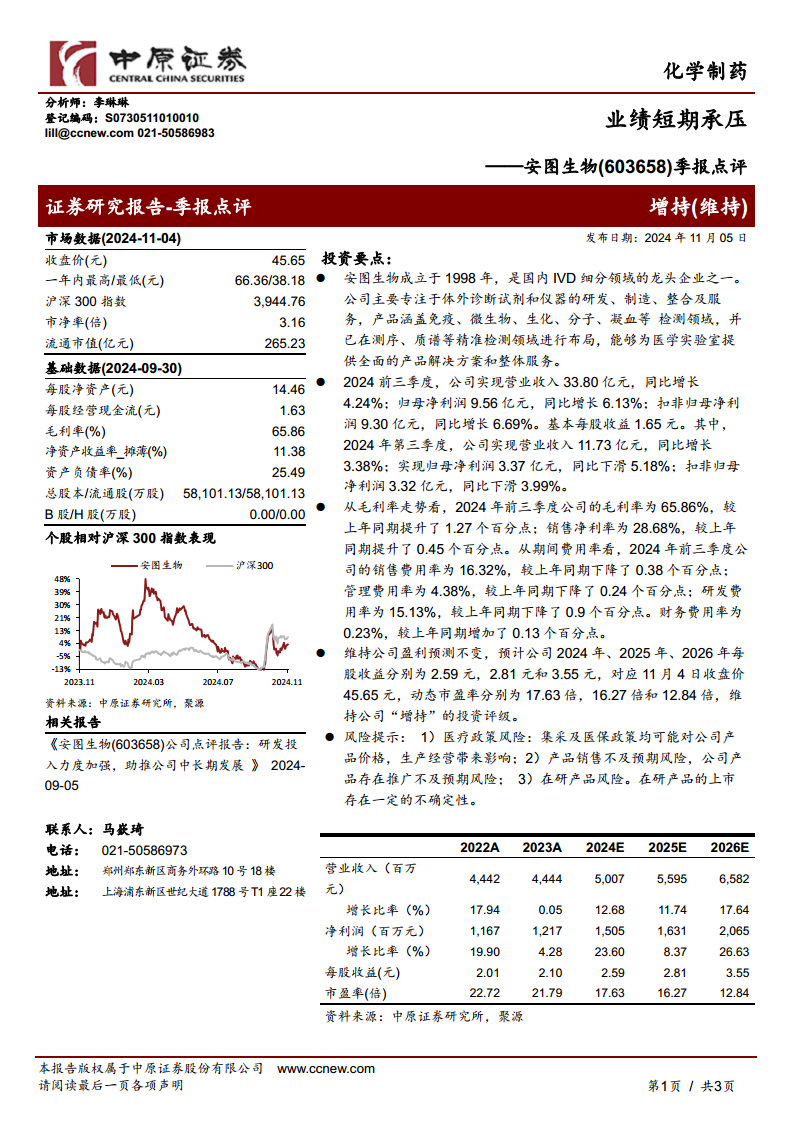 安图生物(603658):季报点评:业绩短期承压