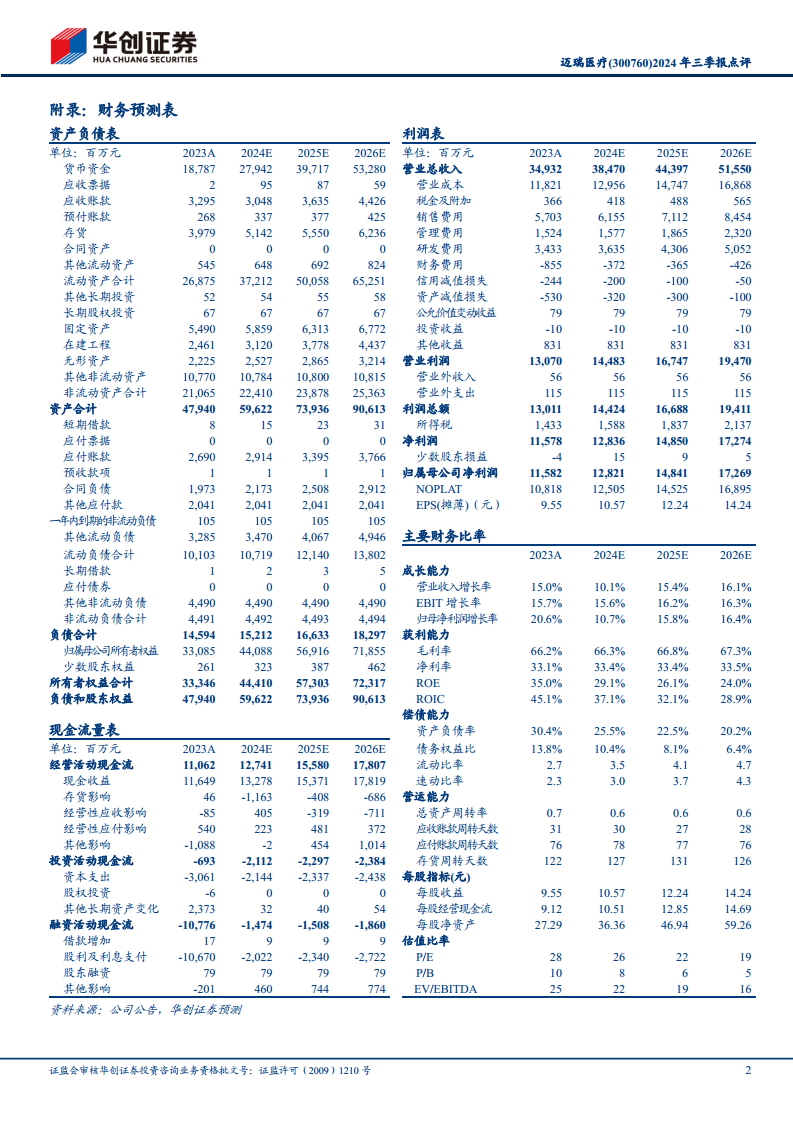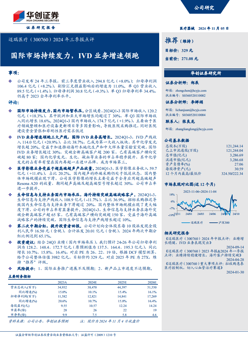 结合2024年第三季度业绩(国内市场承压),华创证券调整了对迈瑞医疗2024-2026年的归母净利润预测,分别为128.2亿元、148.4亿元和172.7亿元(原预测为137.5亿元、164.4亿元、195.3亿元),同比增速分别为10.7%、15.8%和16.4%,对应PE分别为26倍、22倍和19倍。根据DCF模型测算,给予公司整体估值3982亿元,目标价约329元,对应2025年PE为27X,维持“推荐”评级。 风险提示包括国际业务推广进展不及预期和新产品上市进度不达预期。