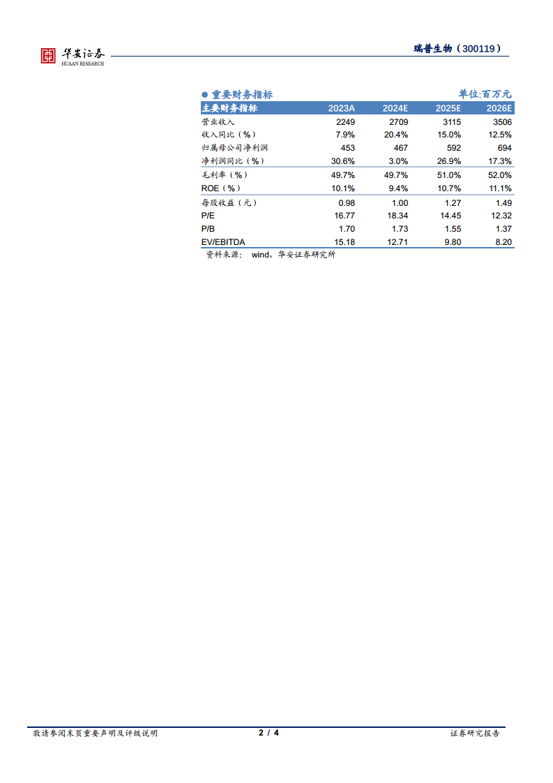 投资建议与风险提示: 华安证券维持瑞普生物“买入”评级。预计2024-2026年公司营业收入将分别达到27.1亿元、31.2亿元和35.1亿元,同比增速分别为20.4%、15.0%和12.5%。同期归母净利润预计分别为4.67亿元、5.92亿元和6.94亿元,同比增速分别为3.0%、26.9%和17.3%。对应EPS分别为1.0元、1.27元和1.49元。公司面临的主要风险包括疫苗政策变化、动物疫病爆发以及产品研发风险。