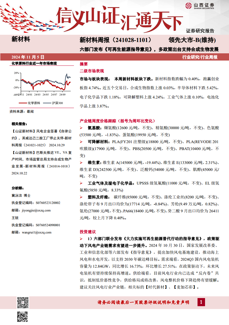 本周新材料周报深入分析了2024年10月28日至11月1日期间新材料市场的表现、产业链数据及行业动态。尽管新材料板块整体小幅下跌,但其表现优于创业板指,且合成生物、可降解塑料和电池化学品等子板块展现出增长潜力。政策层面,国家六部门联合发布《可再生能源替代行动指导意见》,为风电产业带来显著利好;同时,陕西和广州等地相继出台政策,大力支持合成生物产业发展,预示着该领域巨大的市场增长空间。产业链数据跟踪显示,氨基酸、可降解塑料、工业气体和电子化学品等细分领域价格呈现分化,高性能纤维市场在产量和产能利用率方面有所提升。基于政策驱动和市场前景,报告建议重点关注风电产业链中的【时代新材】、【麦加芯彩】以及合成生物产业链中的平台型龙头企业【华恒生物】、【凯赛生物】、【蓝晓科技】,同时提示投资者需警惕原材料价格波动、政策变化、技术发展不及预期及行业竞争加剧等风险。