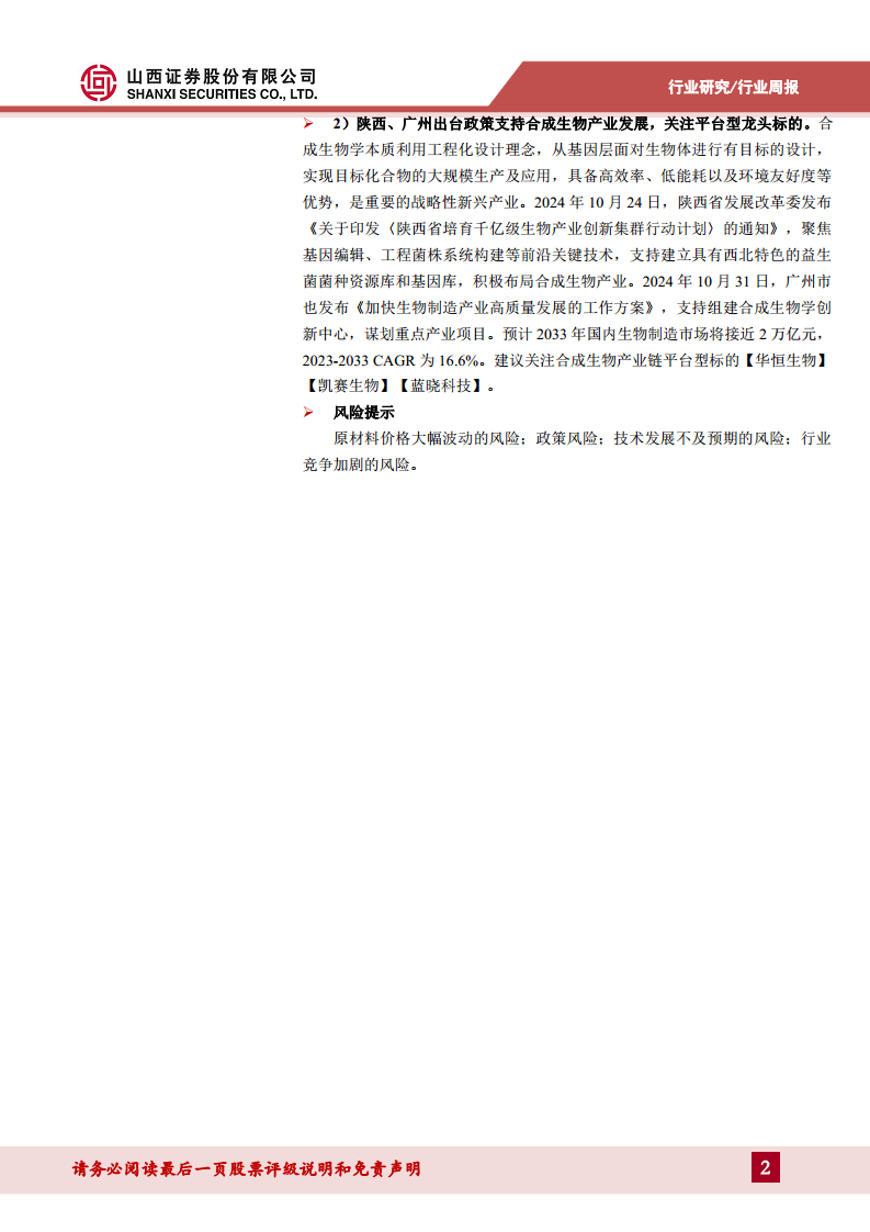 陕西和广州等地出台政策支持合成生物产业发展,凸显其作为高效率、低能耗、环境友好型战略性新兴产业的重要性。预计2033年国内生物制造市场将接近2万亿元,2023-2033年复合年增长率(CAGR)为16.6%。建议关注合成生物产业链平台型标的,如【华恒生物】、【凯赛生物】、【蓝晓科技】。