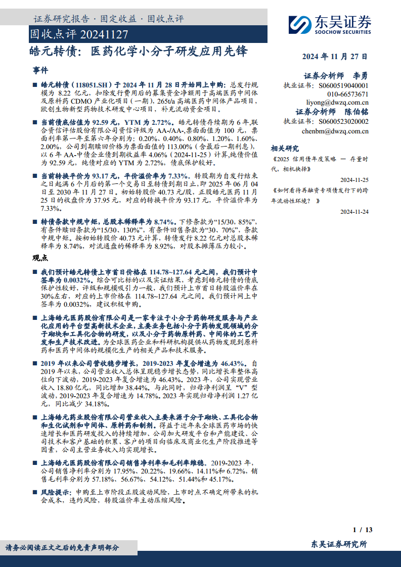 皓元转债(118051.SH)作为医药化学小分子研发应用先锋皓元医药发行的可转债,具备较好的债底保护,预计上市首日价格区间为114.78至127.64元,建议投资者积极申购。正股皓元医药营收稳健增长,毛利率表现突出,在小分子药物研发服务与产业化应用领域具有领先地位和一体化服务平台优势。尽管存在正股波动、上市时点不确定等风险,但综合来看,皓元转债仍具有一定的投资吸引力。