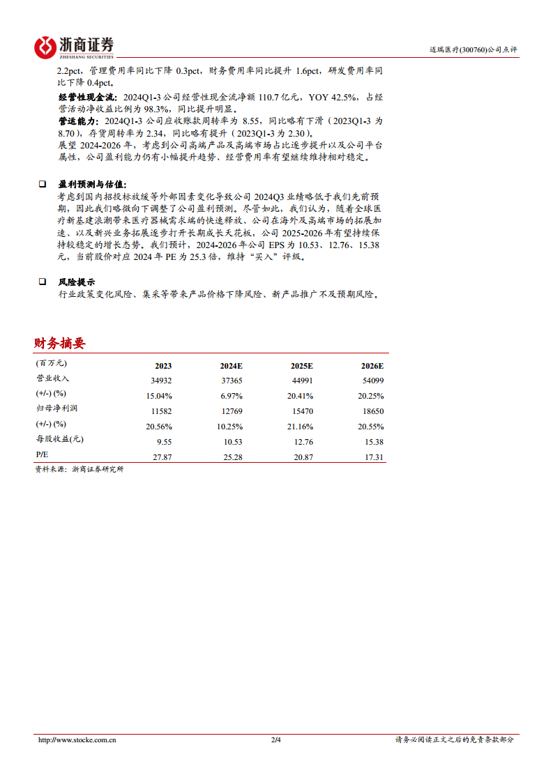 迈瑞医疗在2024年前三季度表现出整体稳健的增长态势,尽管第三季度国内市场受宏观环境影响出现短期波动,但国际市场凭借高端战略和新兴业务的持续突破,实现了强劲增长,有效对冲了国内压力。公司在体外诊断和医学影像等核心产线持续优化产品结构,高端产品占比提升,且经营性现金流表现优异,显示出良好的盈利能力和营运效率。尽管分析师略微下调了短期盈利预测,但基于全球医疗新基建、海外及高端市场拓展以及新兴业务的长期增长潜力,维持“买入”评级,认为公司长期投资价值不变。投资者需关注行业政策变化、集采降价及新产品推广不及预期等风险。