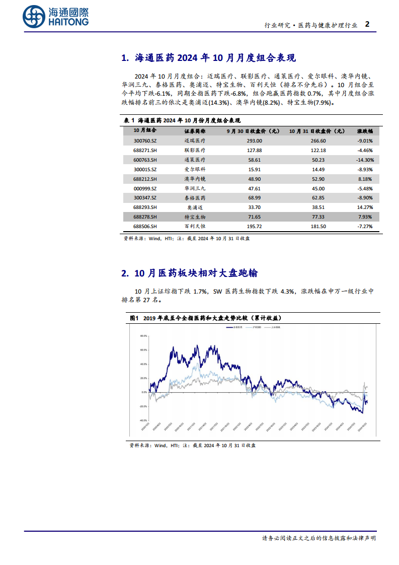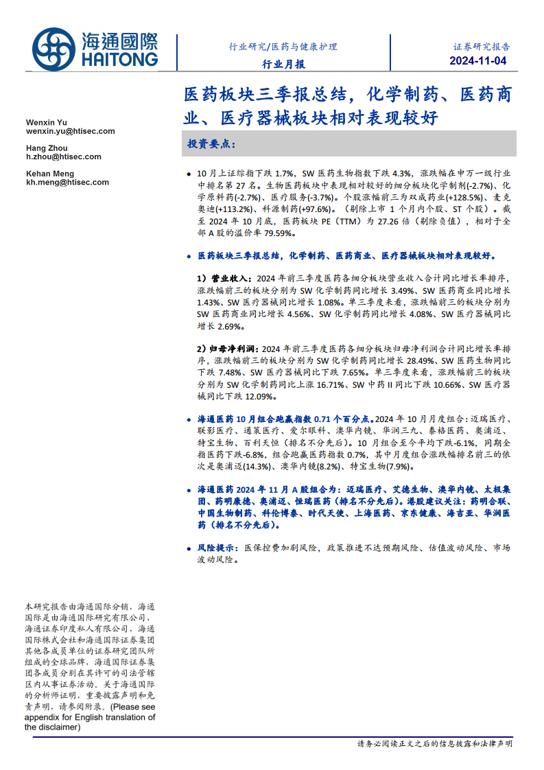 本报告深入分析了2024年10月医药生物板块的市场表现、三季报业绩总结以及海通医药的投资组合策略。核心观点如下: