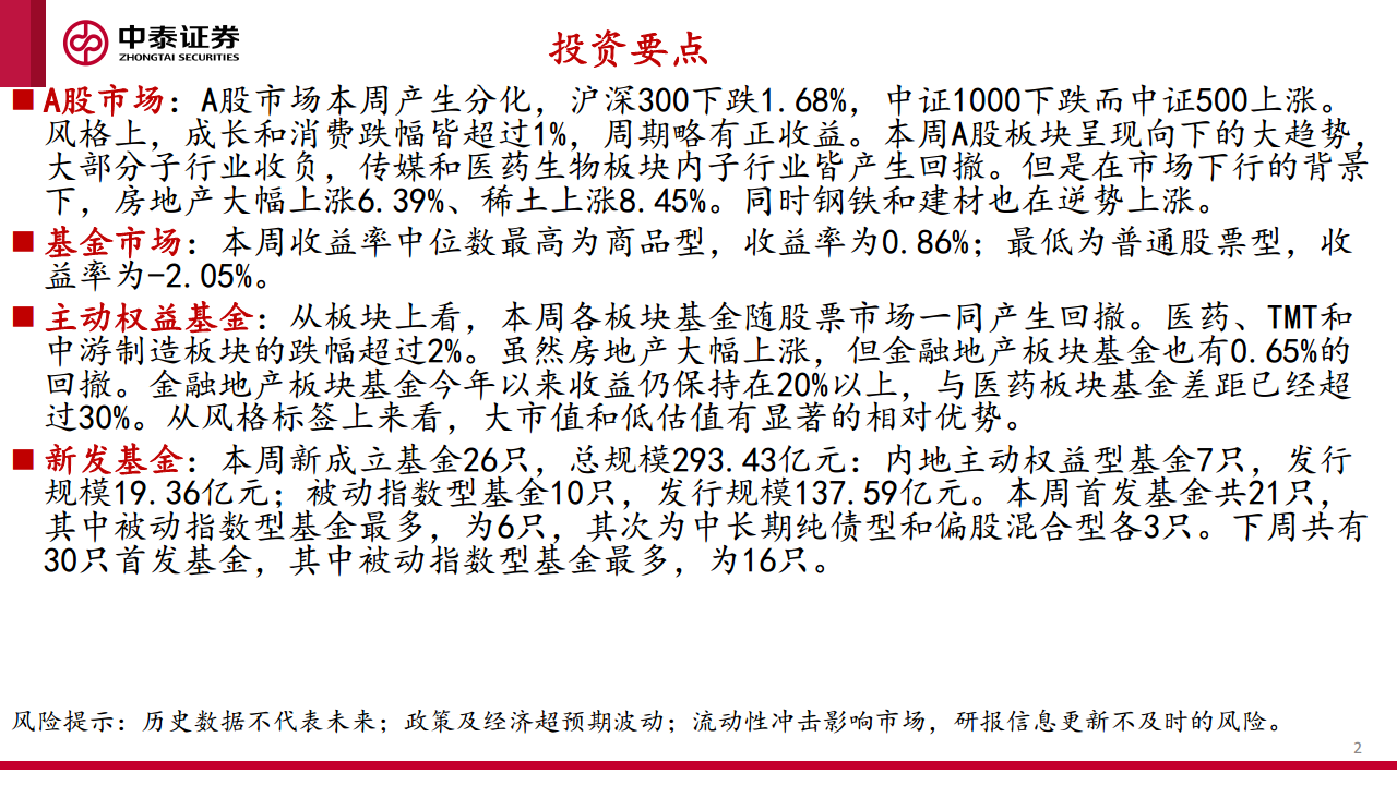 从板块表现来看,本周主动权益基金普遍随股票市场一同回撤。医药、TMT和中游制造板块基金的跌幅均超过2%。尽管房地产板块股票大幅上涨,但金融地产板块基金仍有0.65%的回撤。值得注意的是,金融地产板块基金今年以来的收益率仍保持在20%以上,与医药板块基金的差距已超过30%,显示出其在长期表现上的显著优势。从风格标签分析,大市值和低估值风格的基金在本周表现出显著的相对优势。