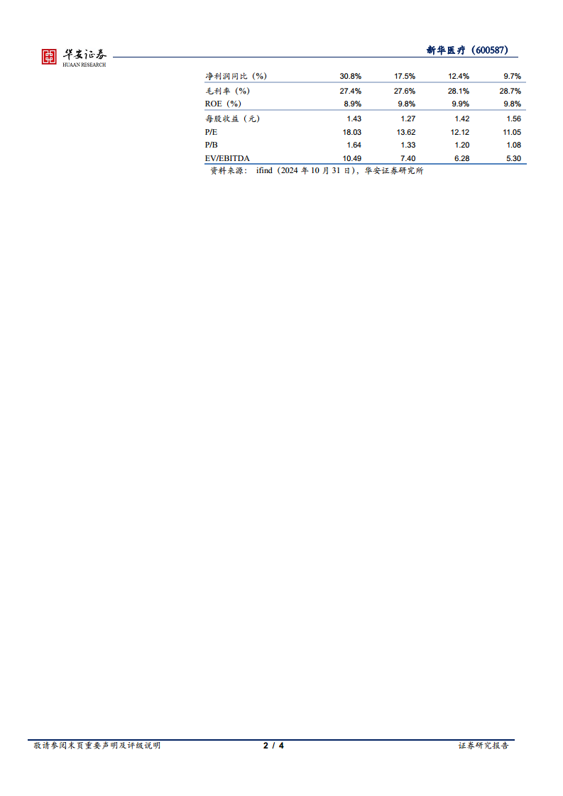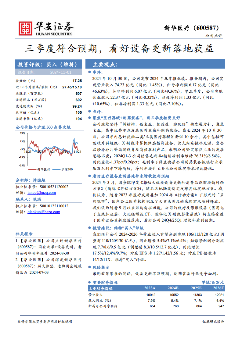新华医疗在2024年前三季度表现出稳健的经营态势,通过聚焦医疗器械和制药装备主业,并有效实施成本控制,实现了归母净利润的良好增长。尽管制药装备板块面临一定压力,但公司在高端医疗器械领域的持续创新和产品获批,为其未来发展奠定了基础。展望未来,国家推动大规模医疗设备更新的政策将成为公司业绩增长的重要驱动力,特别是其放疗及影像设备有望直接受益,预计在2024年第四季度和2025年第一季度带来营收和利润的提升。华安证券维持“买入”评级,并对公司未来三年的营收和净利润增长持积极预期,但同时提示了采购政策波动、设备更新不及预期以及制药装备行业竞争加剧等潜在风险。总体而言,新华医疗凭借其战略聚焦和政策红利,有望在医疗健康领域持续发展。